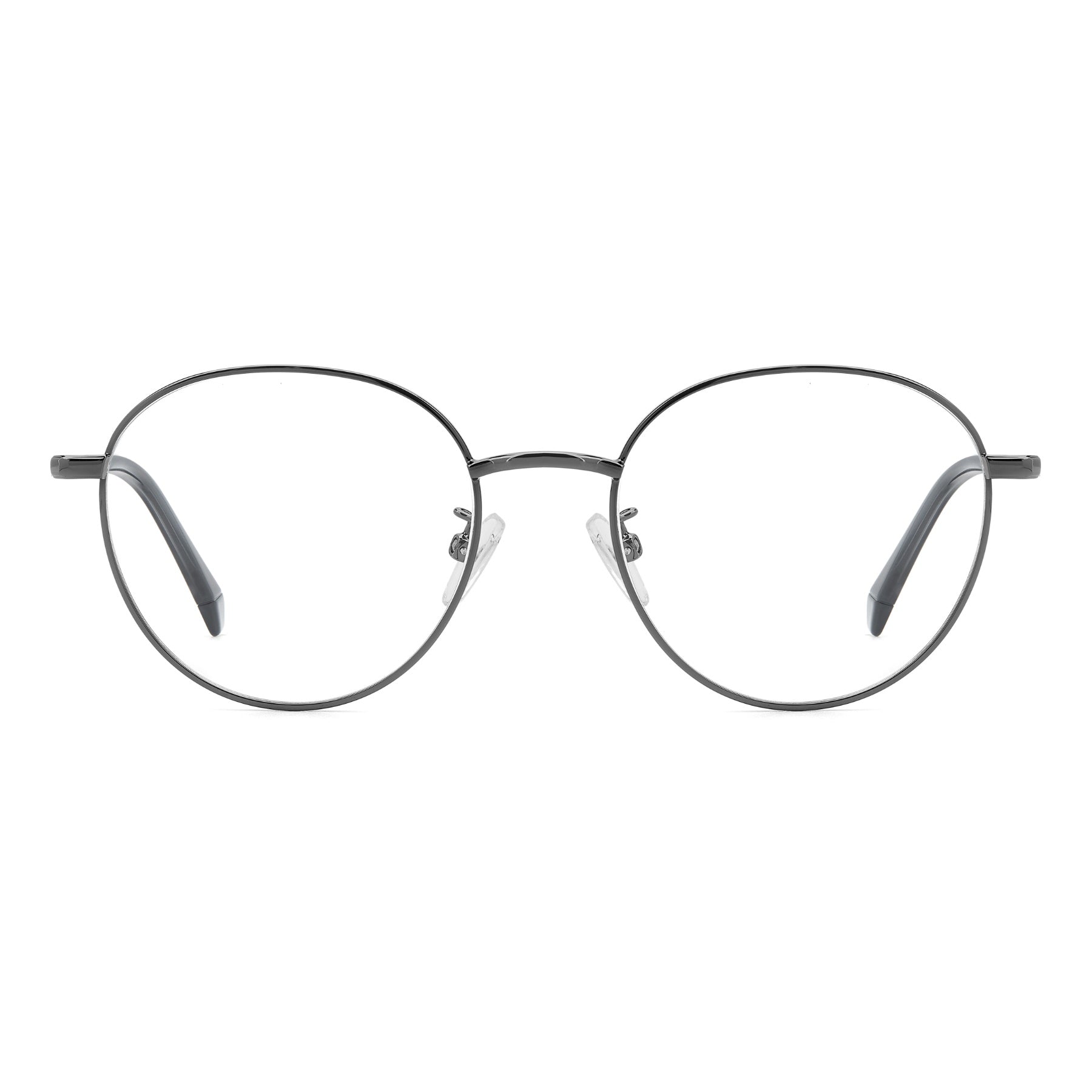 These unisex eyeglasses by Polaroid have pantos frames and a slender structure in recycled stainless steel. Their rigorous and slightly intellectual character is balanced by the playful transparent end tips with a visible core. They're perfect for men or women, as part of street-style looks or even with formal wear. The elements designed for comfort abound: adjustable nose pads, two different frame sizes, and a Global Fit.