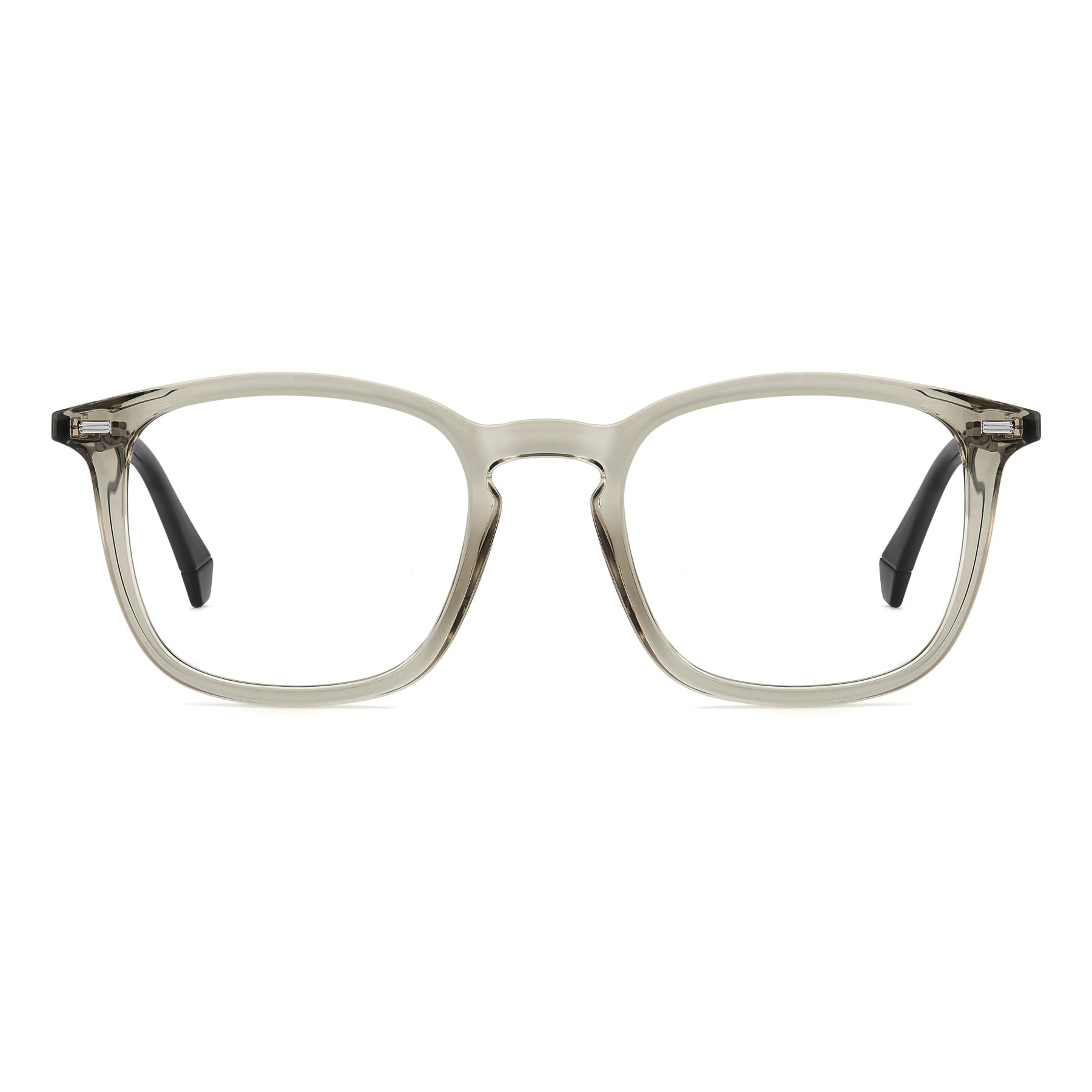 These men's glasses by Polaroid are a deliberate and responsible choice. Their design is a best-seller, updated and made from bio-based materials. The front has a square shape with softened corners and a keyhole bridge: practically a classic to invest in. The metal rivets elevate its style, as does the chiselled metal insert on the temples near the hinge. They come in neutral tones or with transparencies for a fresh touch.