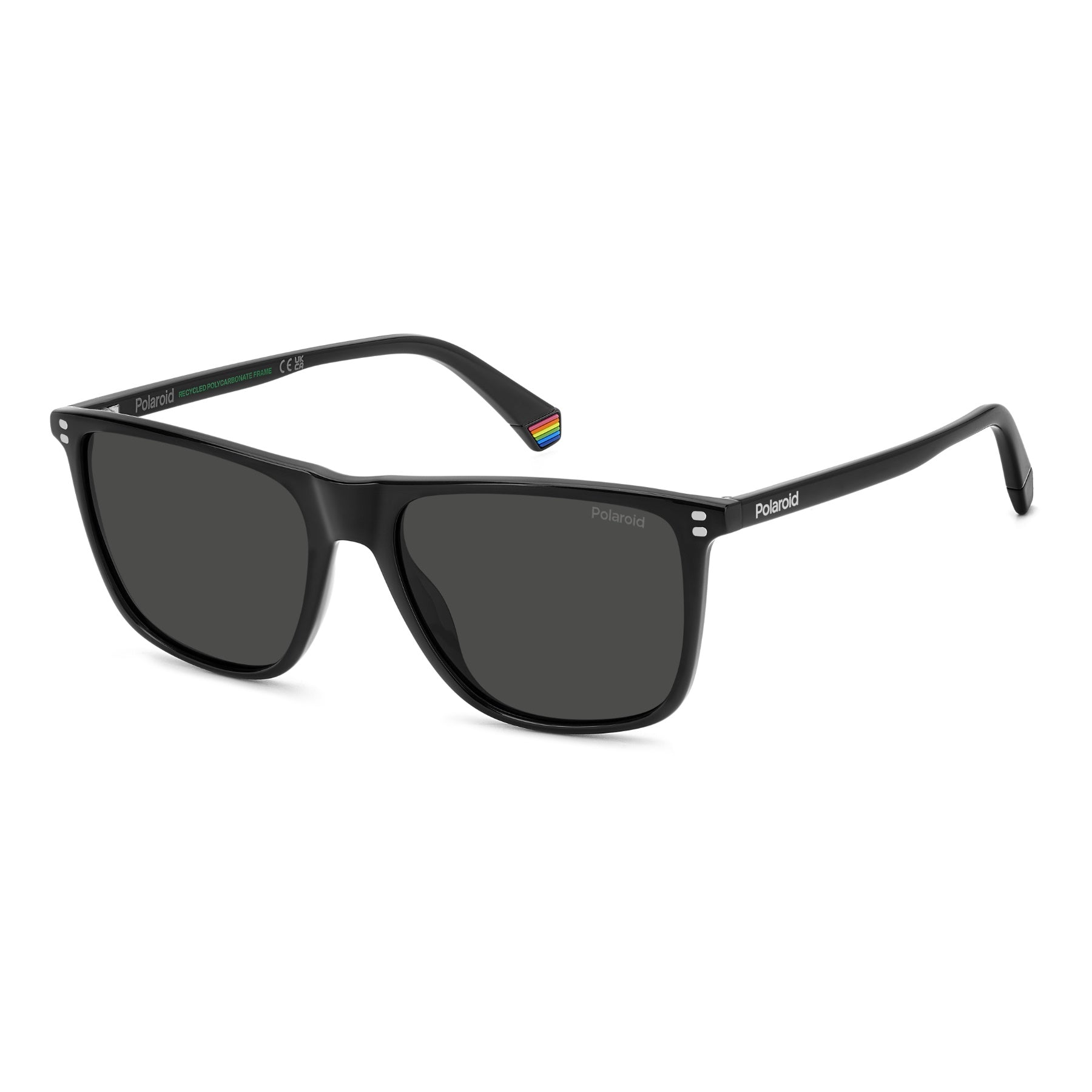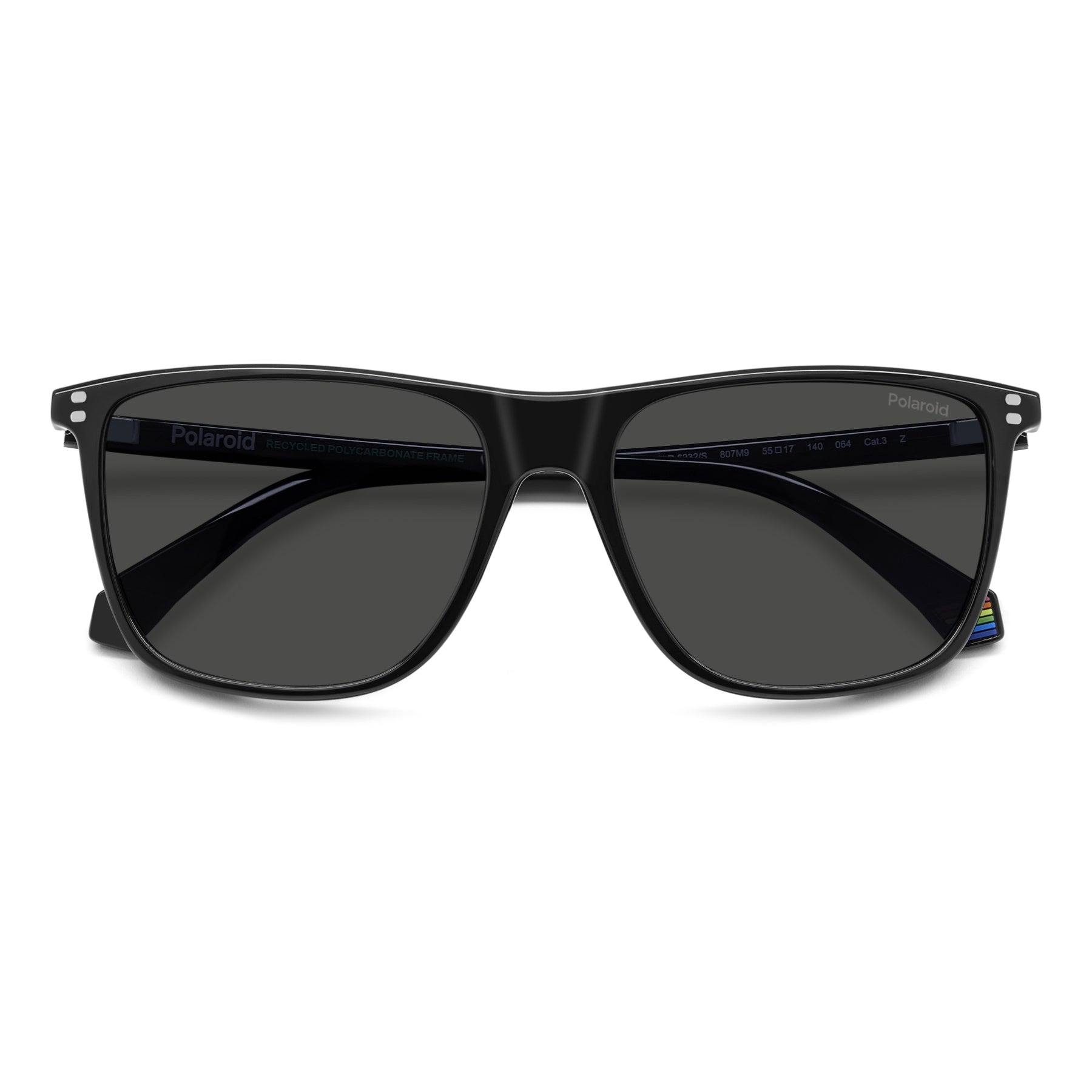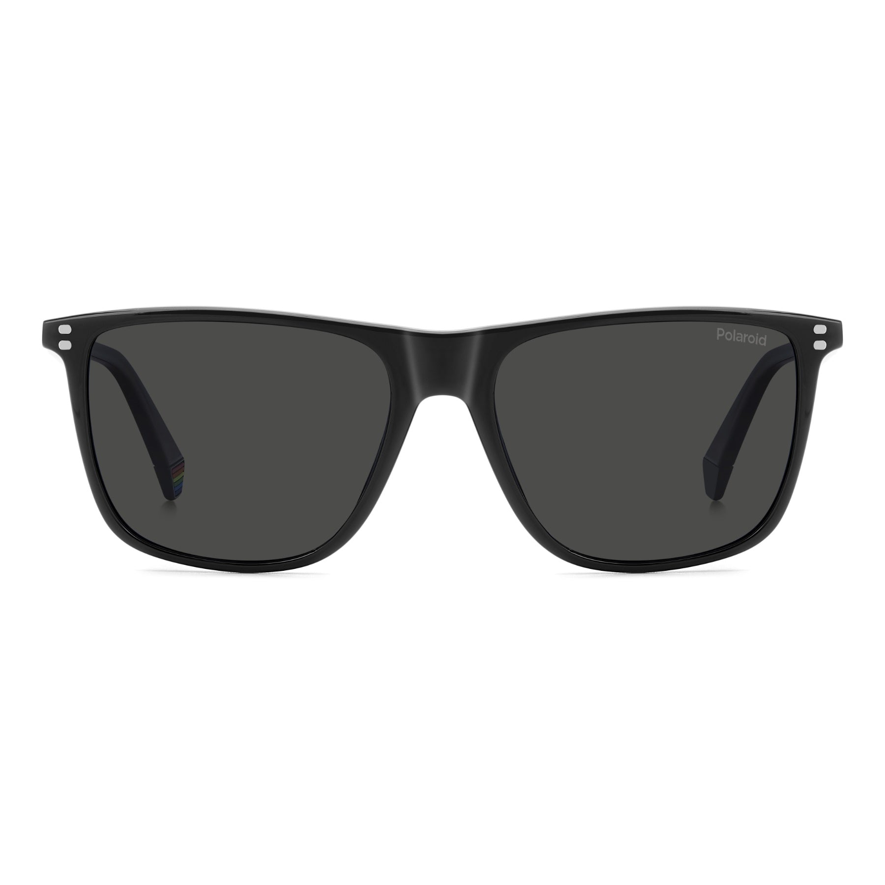 These Polaroid sunglasses for men are always impeccable: their secret lies in the mix of slender lines and cool details. The front is rectangular, decorated by rivets inspired by the new Polaroid logo. The temples are slim and light weight. The rainbow on the end tip is an unexpected detail. In classic colours and on-trend hues, these frames are impeccable even when hooked onto a jumper or t-shirt as a finishing touch.