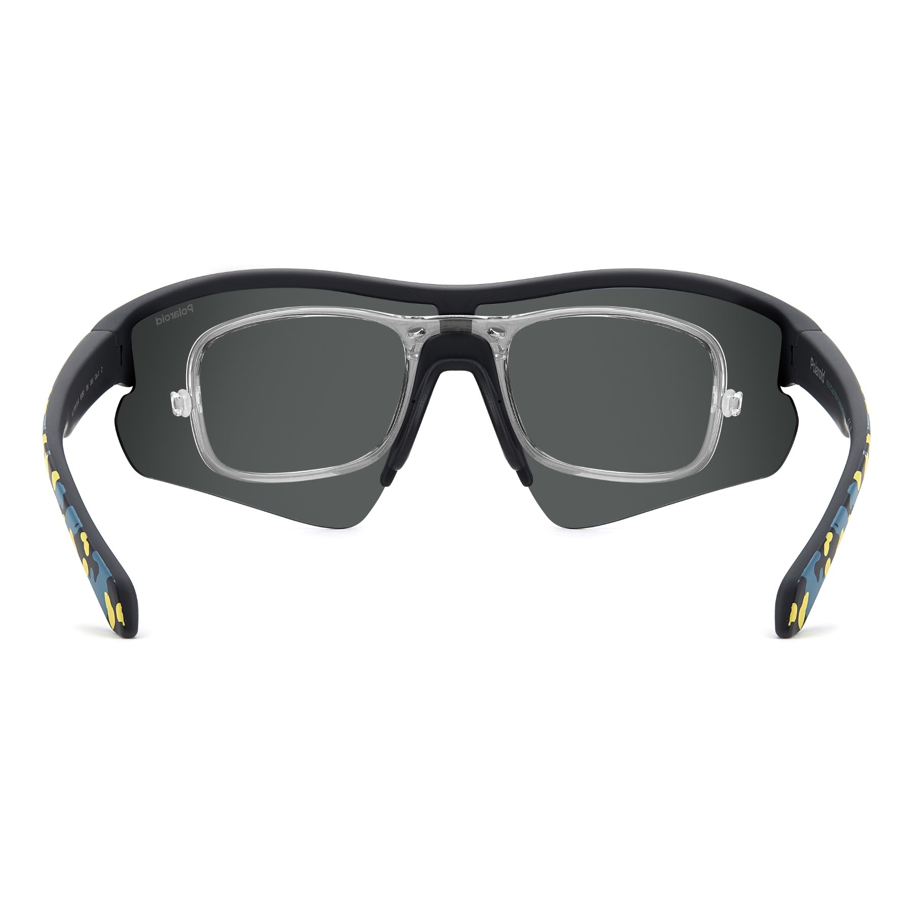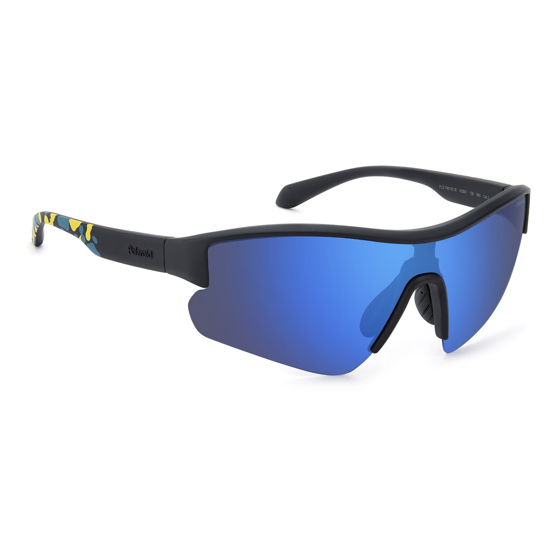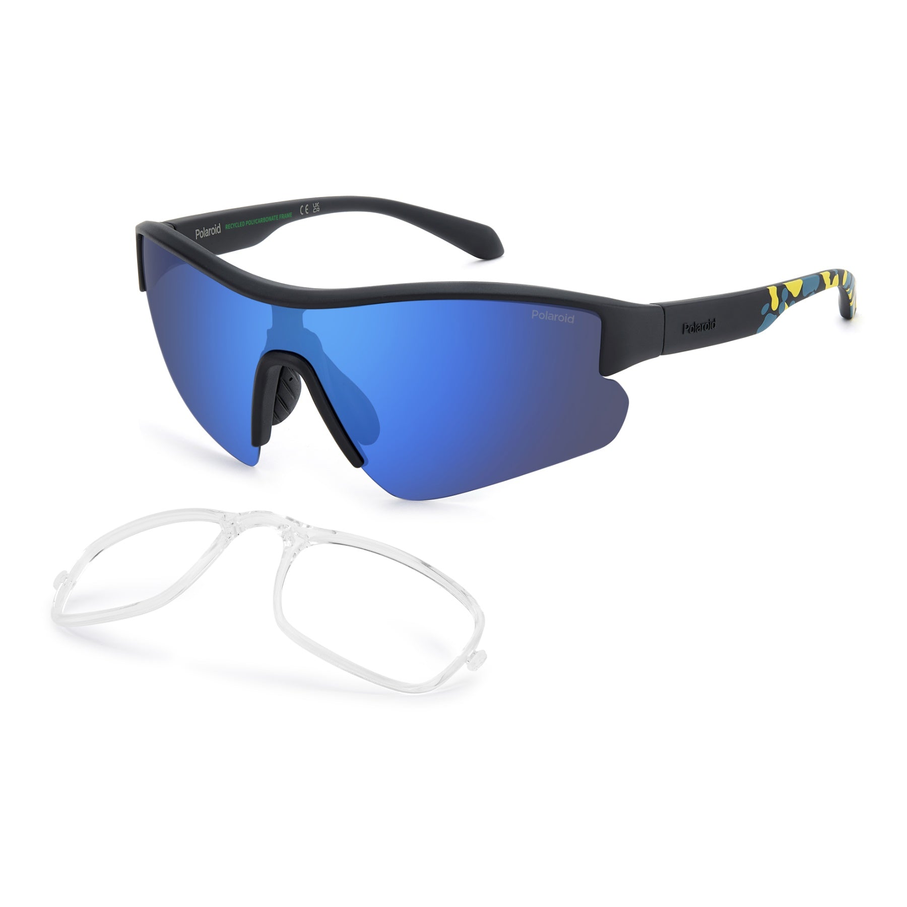 Occhiali da sole unisex Polaroid Eyewear con design a maschera. Presentano fit avvolgente, assetto aerodinamico e naselli in gomma dal grip ottimale. La struttura è in eco-policarbonato, leggera e resistente all’uso. È corredata dal clip-in da vista, personalizzabile con la gradazione preferita, da agganciare sotto la lente da sole. Disponibile nelle varianti con pattern sui terminali, esempio di stile performante che lascia il segno.